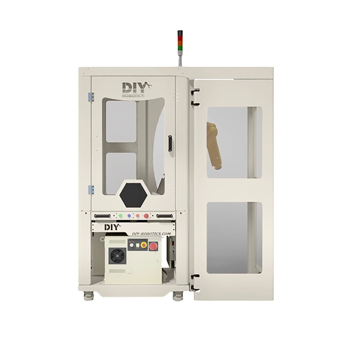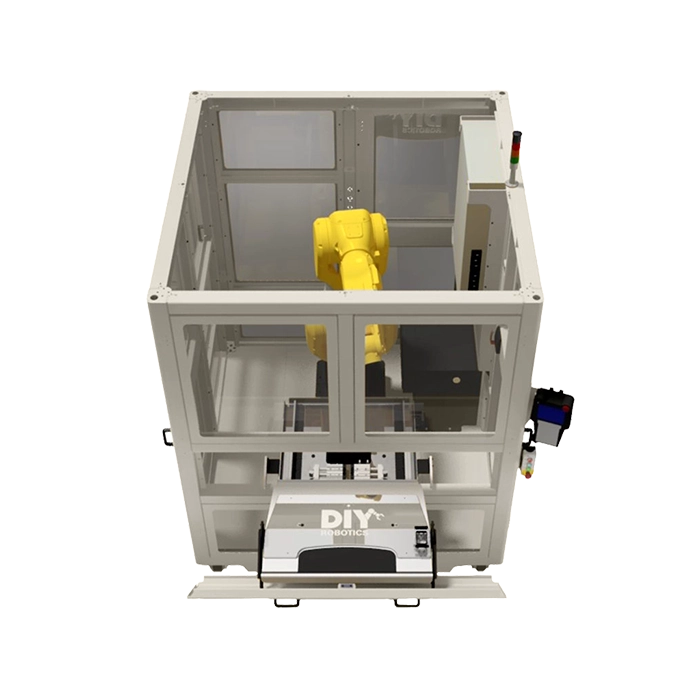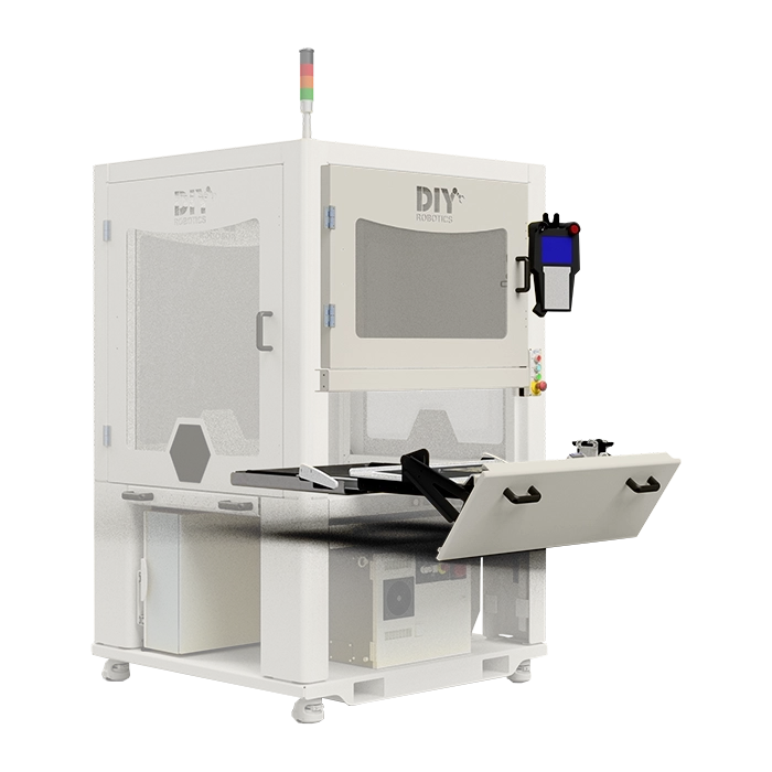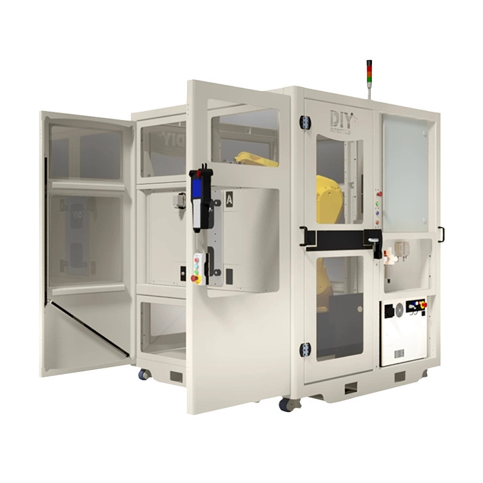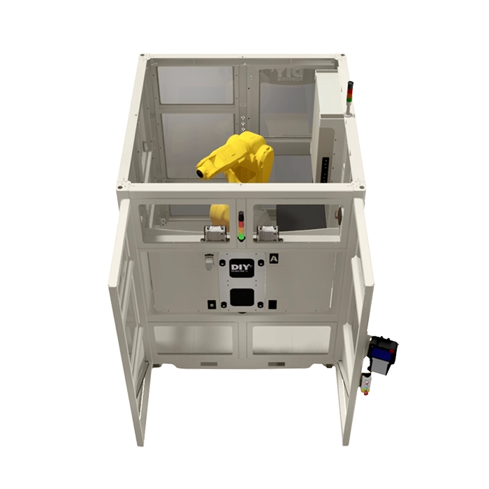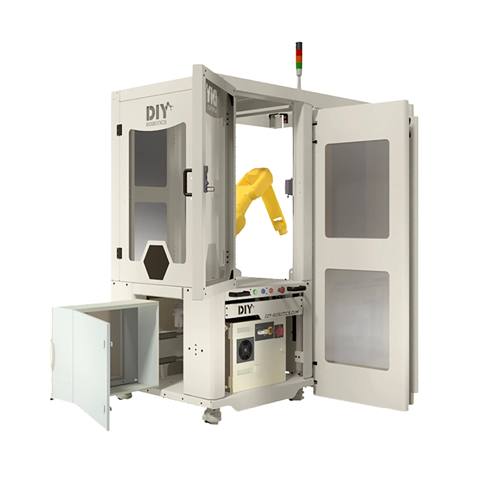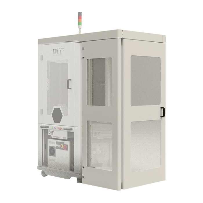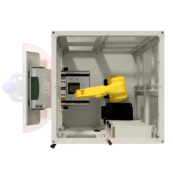 By adding this standard DIY Robotics option to your cell, you are not only avoiding having to move the cell to reach equipment, but you are doing to safely because the complete structure of the sliding door is top-mounted.