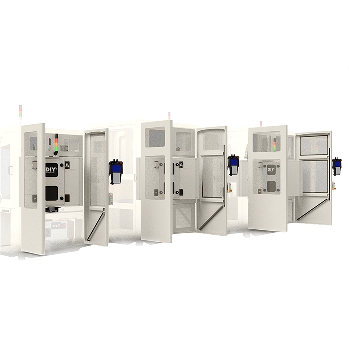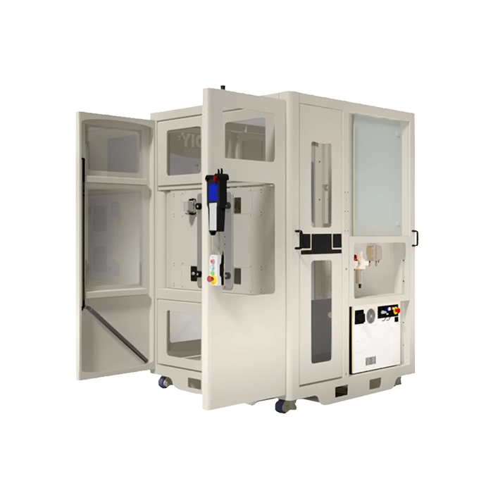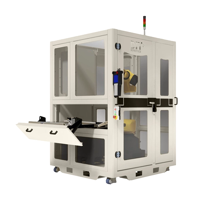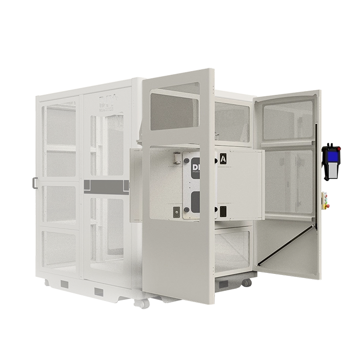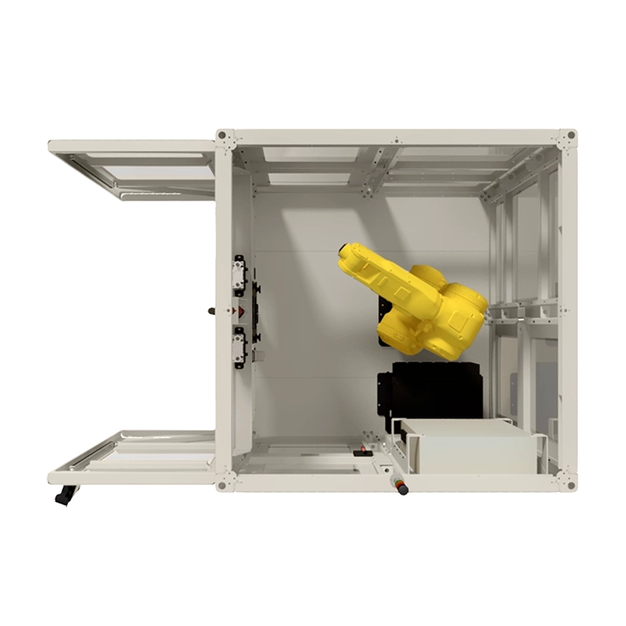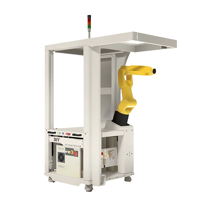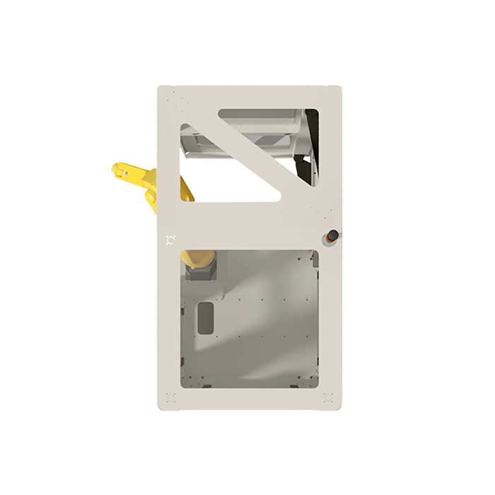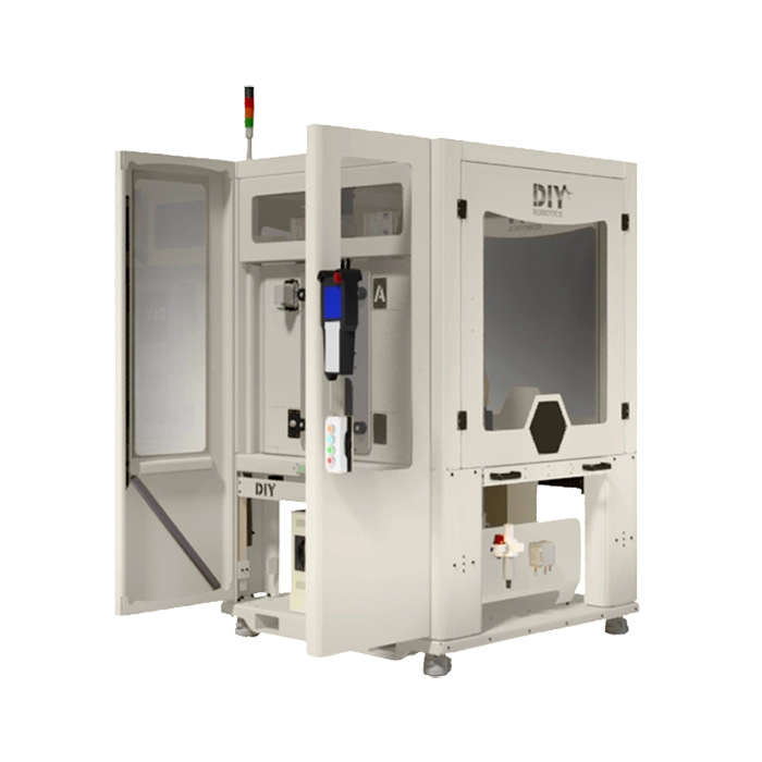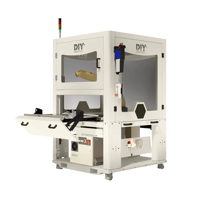 By adding this standard DIY Robotics option to your cell, you are not only avoiding having to move the cell to reach equipment, but you are doing to safely because the complete structure of the sliding door is top-mounted.